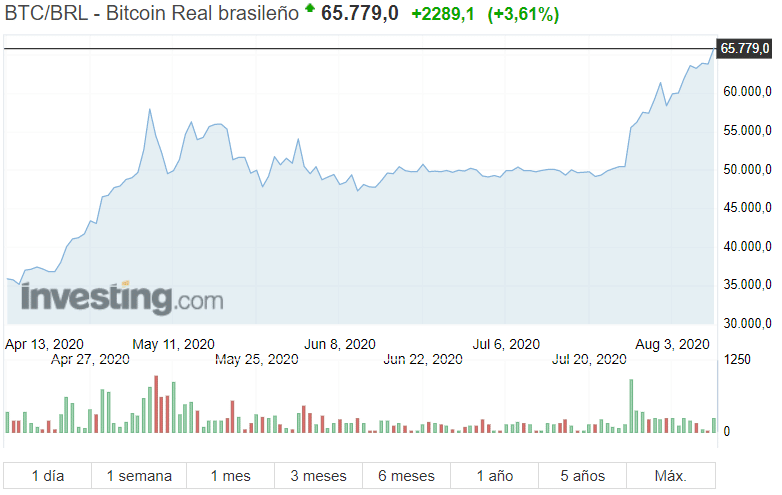 El incremento del precio de Bitcoin, expresado en reales, fue del 64% desde enero, cuando valía BRL 39.921, hasta ahora.