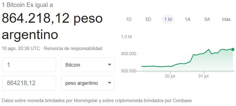 El lector que desee chequear la veracidad de la información aquí presentada podrá notar que, al buscar el valor de Bitcoin en pesos argentinos en Google, el buscador arroja números considerablemente menores a los aquí expresados.