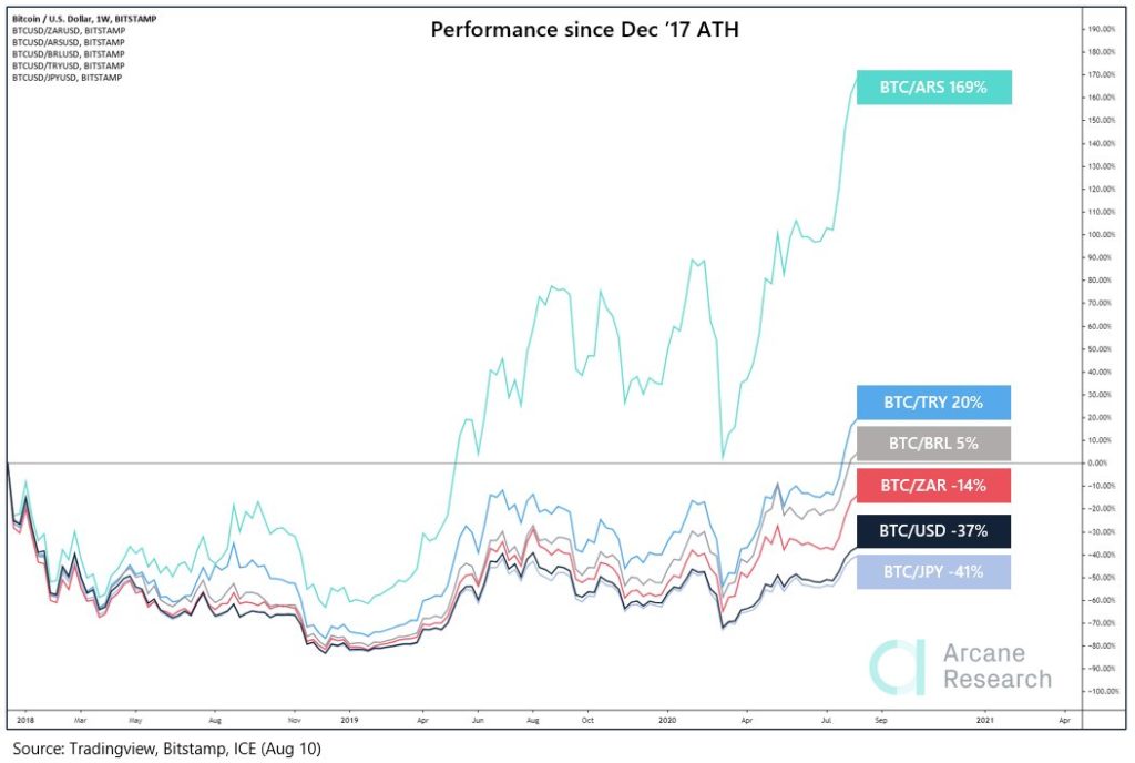 Si un argentino o un brasilero hubiera adquirido Bitcoin (BTC) con su moneda local en diciembre de 2017, cuando Bitcoin estaba en su precio máximo de USD 20.089, hoy estaría en “ganancia” en términos nominales. El argentino tendría un 169% más de pesos y el brasilero un 5% más de reales.