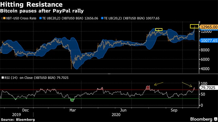 Después de haber llegado a los USD 13.000 por primera vez en más de 14 meses, algunos analistas técnicos sugieren que bitcoin (BTC) está sobrevaluado. El motivo de este “sobreprecio”, indican, es la exuberancia que provocó el anuncio de que PayPal incorporará esta y otras criptomonedas en su plataforma.