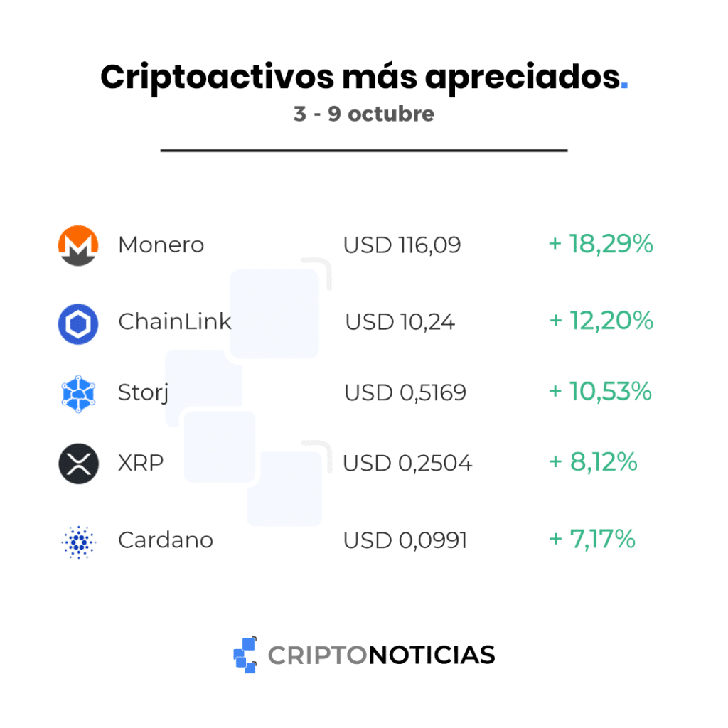 Durante la semana del 3 al 9 de octubre el mercado de criptomonedas se presenta mayormente en verde. Casi la totalidad de las altcoins registraron alzas sustanciales y el crecimiento llegó hasta 18%.