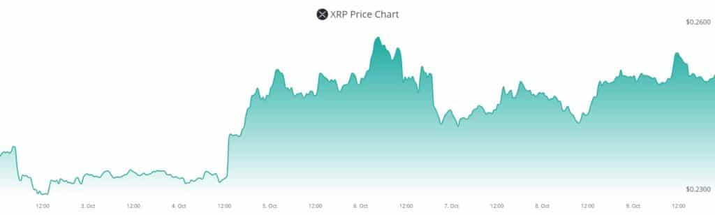 La empresa de pagos Ripple pone en marcha Line of Credit, un nuevo servicio que permite a los usuarios de la solución On-Demand Liquidity (ODL) pedir préstamos en XRP. Según los señalamientos de la empresa, “es la primera vez que probamos un producto en el ámbito de los préstamos”. Previo al anuncio, el precio de XRP venía en ascenso desde el 4 de octubre. Llega a un máximo de USD 0,2582 el día 6, para un crecimiento promedio semanal de 8%.