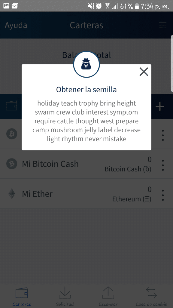 Lo siguiente será respaldar las semillas de recuperación de cada cartera que utilicemos. Esto con la finalidad de poseer una alternativa en el caso de querer utilizar nuestra cartera, ya sea de bitcoins (BTC), ether (ETH) o cualquier otra criptomoneda, en otra aplicación que sea compatible con el uso de estas semillas.